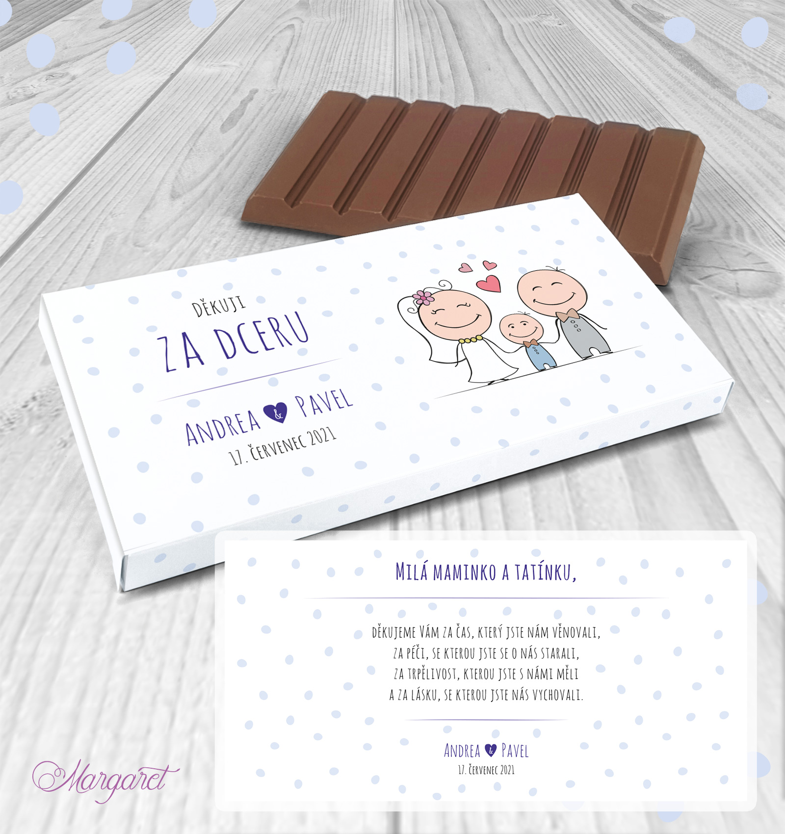 Nabízíme hezké poděkování pro rodiče formou čokolády. Je to pěkný dáreček, na kterém si můžou pochutnat. Na obalu jsou uvedeny vaše jména i datum svatby, takže se jedná o originální osobní pozornost.