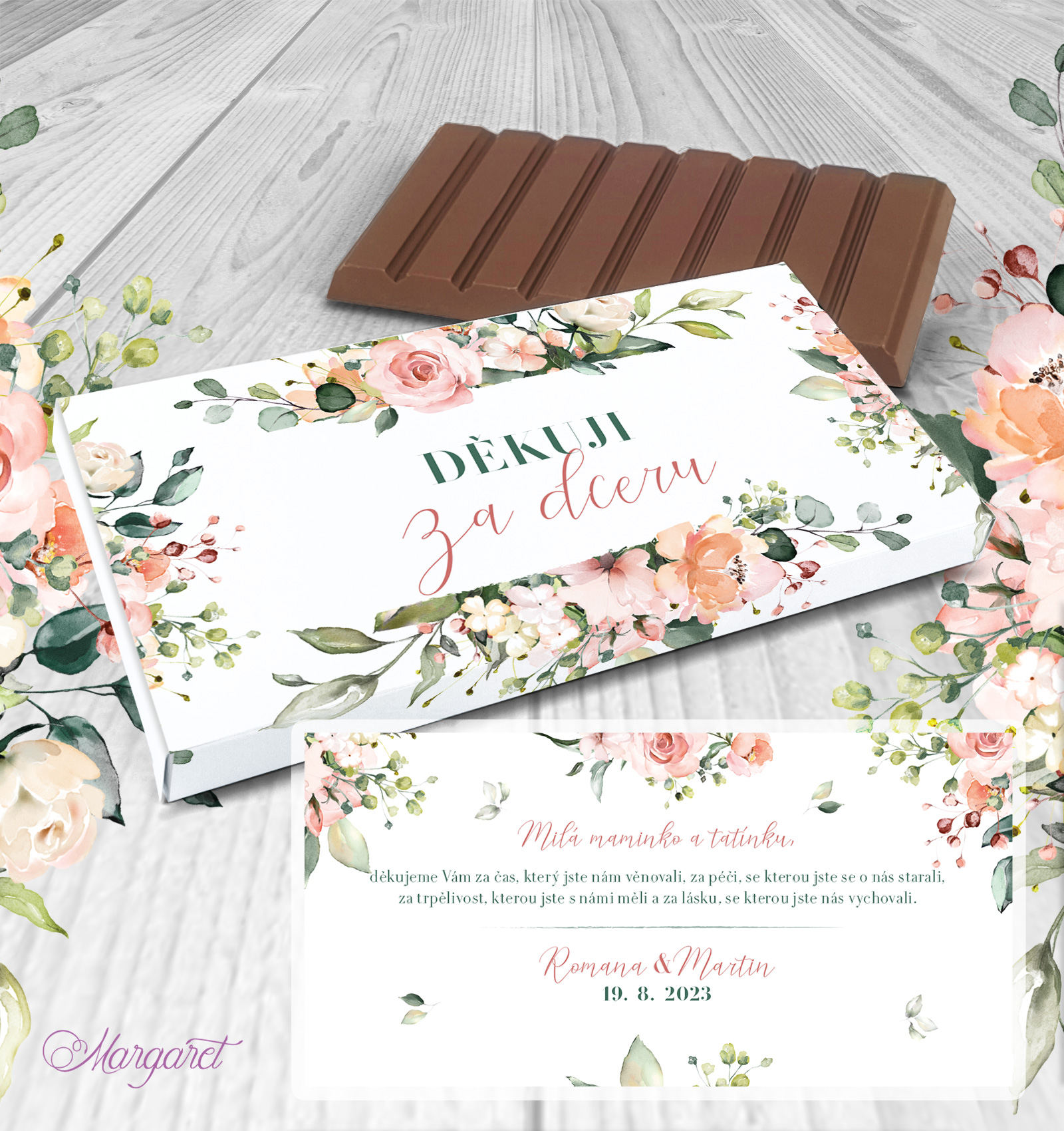 Nabízíme hezké poděkování pro rodiče formou čokolády. Je to pěkný dáreček, na kterém si můžou pochutnat. Na obalu jsou uvedeny vaše jména i datum svatby, takže se jedná o originální osobní pozornost.