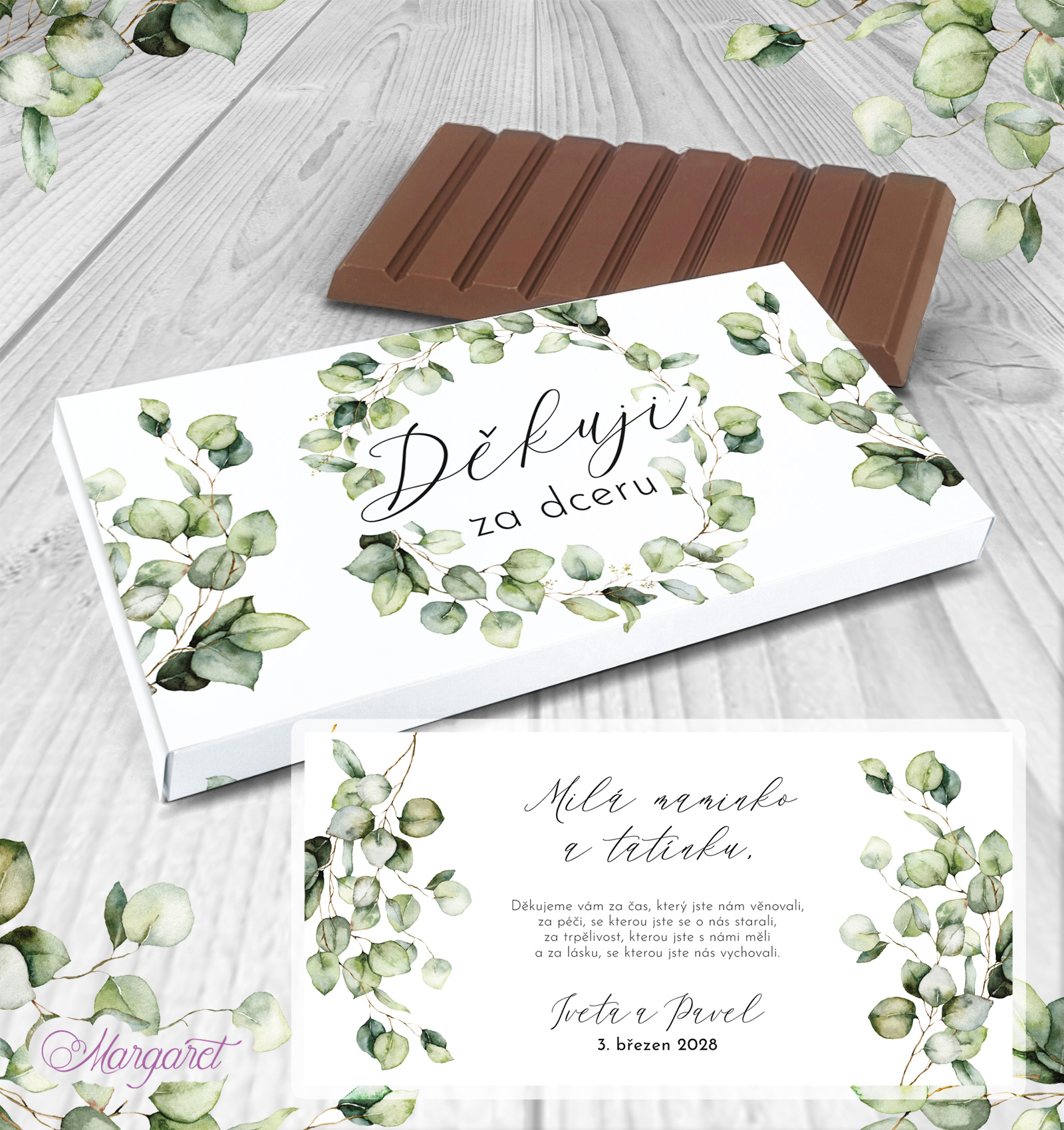 Nabízíme hezké poděkování pro rodiče formou čokolády. Je to pěkný dáreček, na kterém si můžou pochutnat. Na obalu jsou uvedeny vaše jména i datum svatby, takže se jedná o originální osobní pozornost.