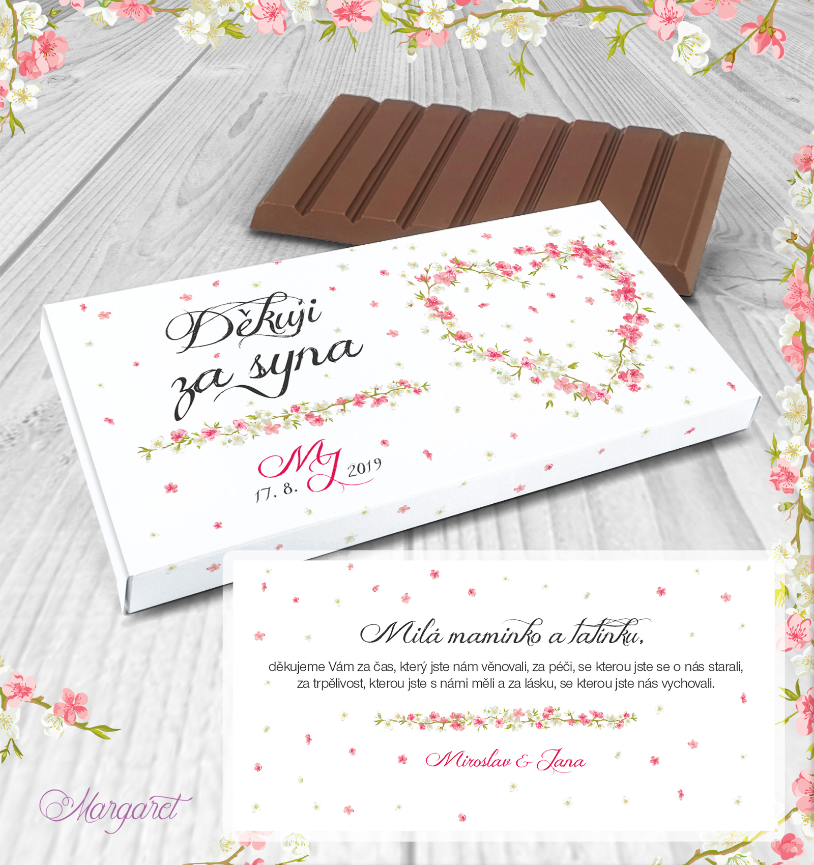 Nabízíme hezké poděkování pro rodiče formou čokolády. Je to pěkný dáreček, na kterém si můžou pochutnat. Na obalu jsou uvedeny vaše jména i datum svatby, takže se jedná o originální osobní pozornost.
