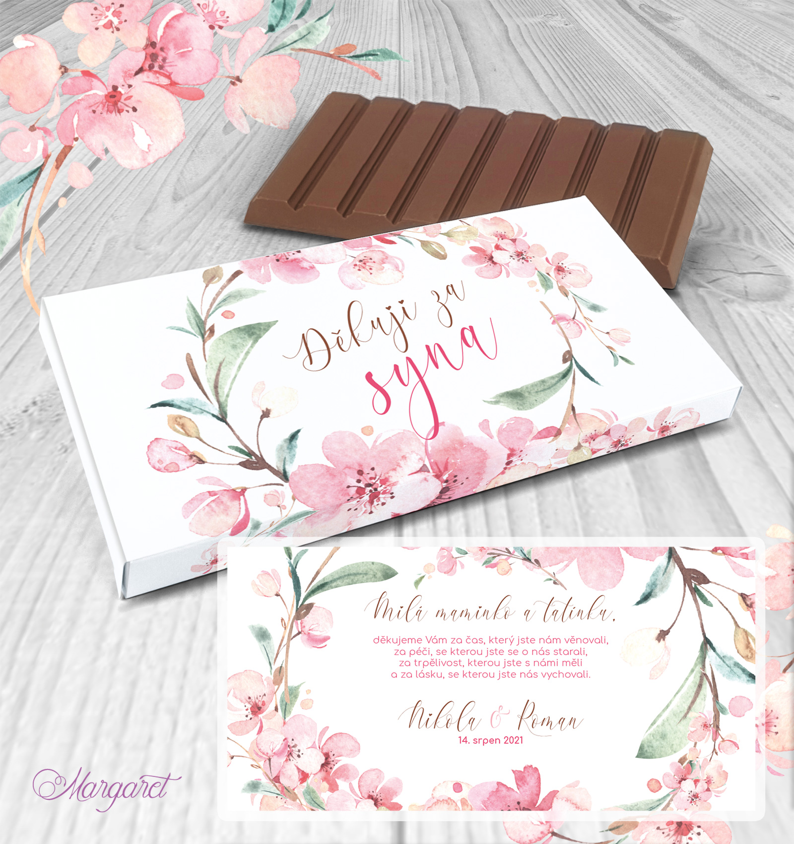 Nabízíme hezké poděkování pro rodiče formou čokolády. Je to pěkný dáreček, na kterém si můžou pochutnat. Na obalu jsou uvedeny vaše jména i datum svatby, takže se jedná o originální osobní pozornost.