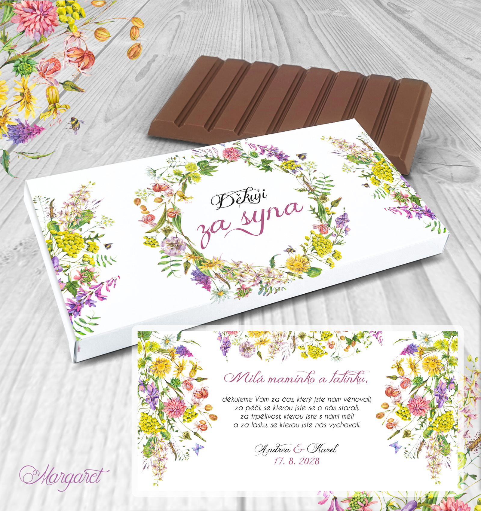 Nabízíme hezké poděkování pro rodiče formou čokolády. Je to pěkný dáreček, na kterém si můžou pochutnat. Na obalu jsou uvedeny vaše jména i datum svatby, takže se jedná o originální osobní pozornost.
