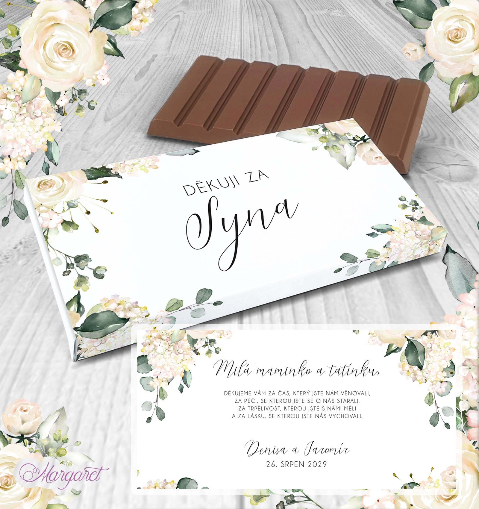 Nabízíme hezké poděkování pro rodiče formou čokolády. Je to pěkný dáreček, na kterém si můžou pochutnat. Na obalu jsou uvedeny vaše jména i datum svatby, takže se jedná o originální osobní pozornost.