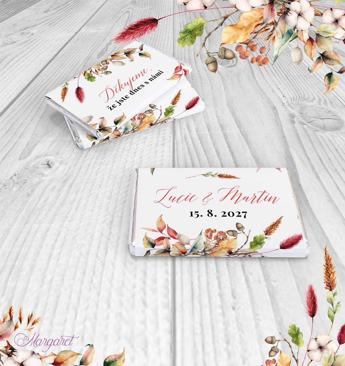 Ve stejném designu pro vás máme také jmenovky, pozvánky ke stolu, čokoládky a mnoho dalšího: Svatební kolekce SK32 – vybírat můžete zde