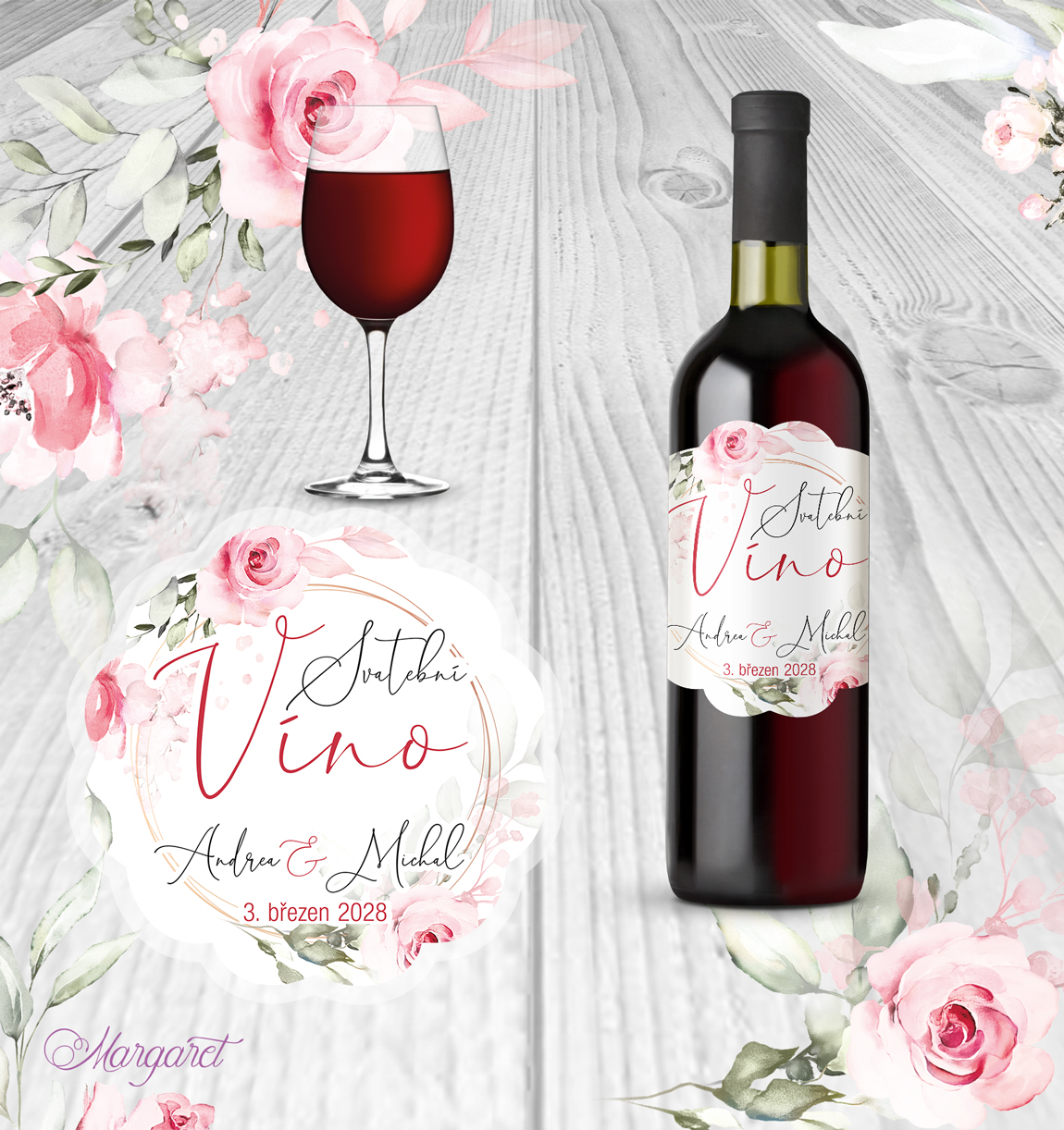 Krásná etiketa na víno v designu svatební kolekce, s Vašimi jmény a datem svatby.