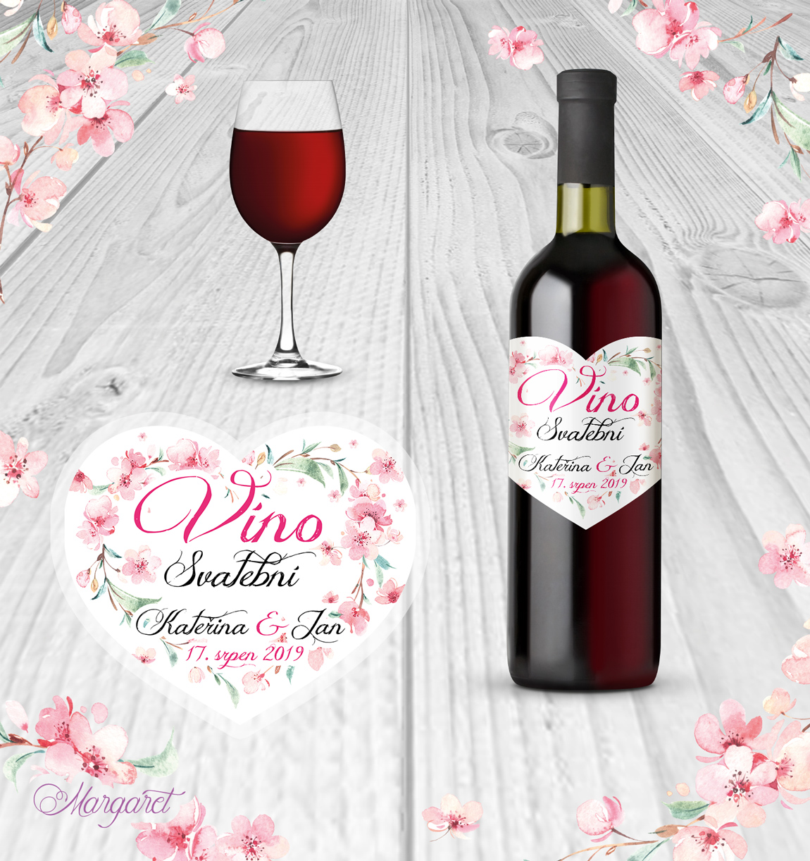 Krásná etiketa na víno v designu svatební kolekce, s Vašimi jmény a datem svatby.