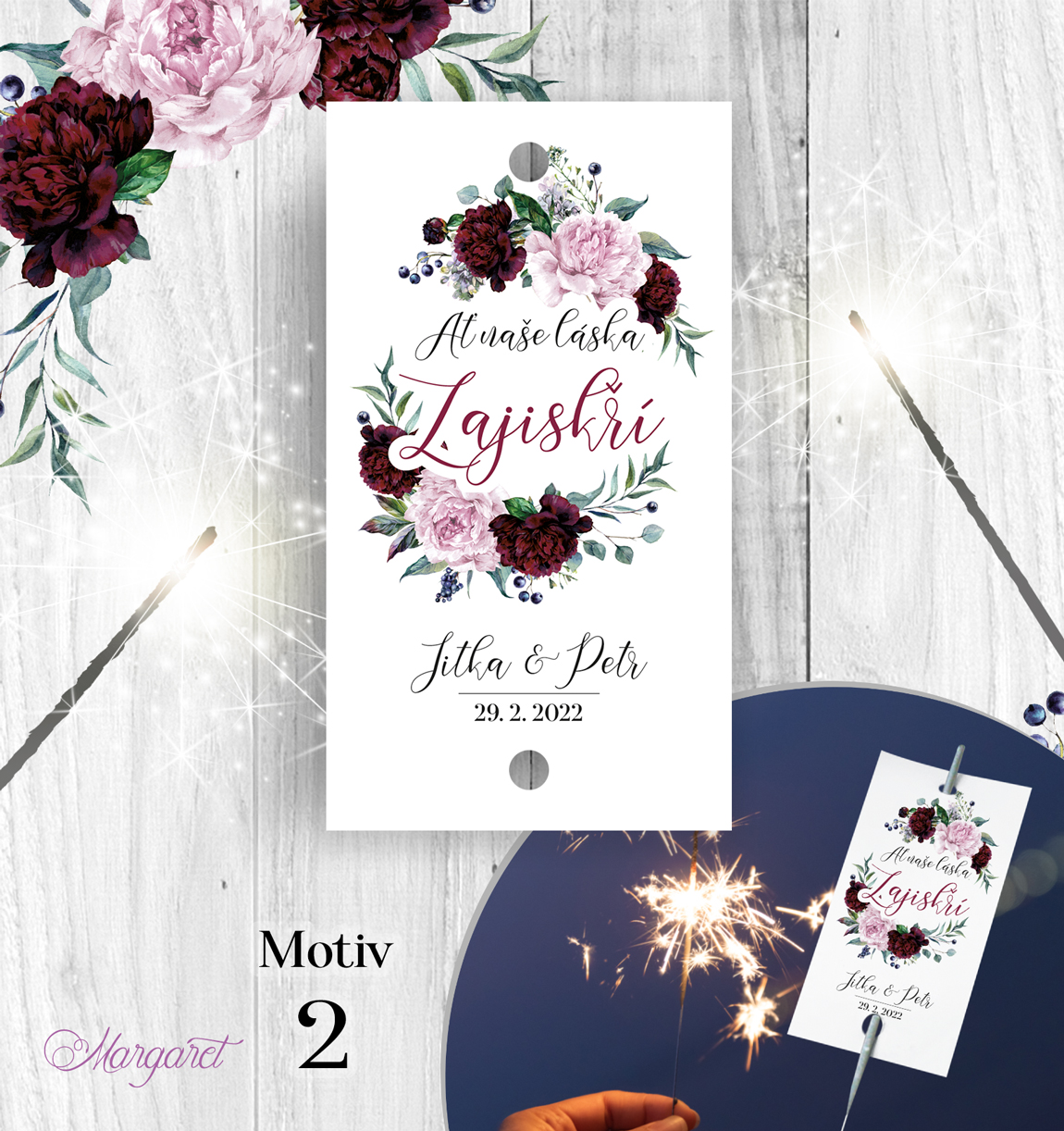 Kartička pro navlečení na prskavu. Obsahuje Vaše jména, datum svatby a dvě dírky pro navlečení prskavky. Prskavka není součástí balení.