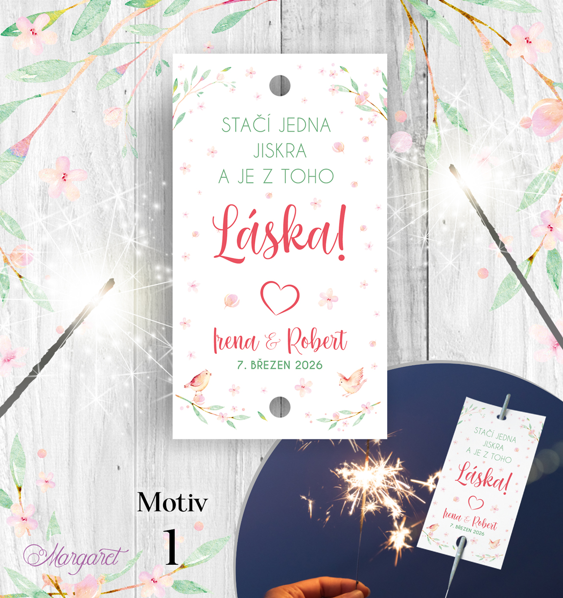 Kartička pro navlečení na prskavu. Obsahuje Vaše jména, datum svatby a dvě dírky pro navlečení prskavky. Prskavka není součástí balení.