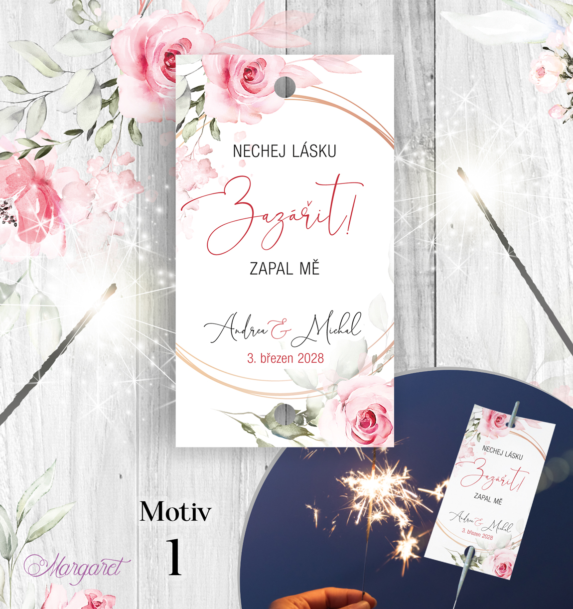 Kartička pro navlečení na prskavu. Obsahuje Vaše jména, datum svatby a dvě dírky pro navlečení prskavky. Prskavka není součástí balení.