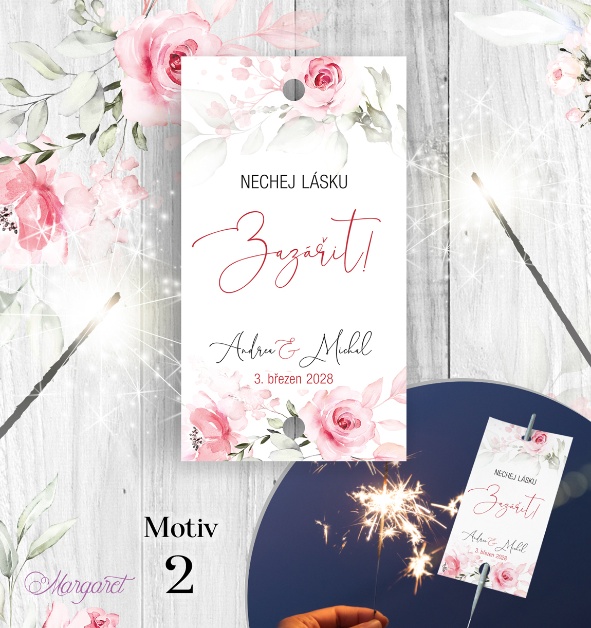 Kartička pro navlečení na prskavu. Obsahuje Vaše jména, datum svatby a dvě dírky pro navlečení prskavky. Prskavka není součástí balení.