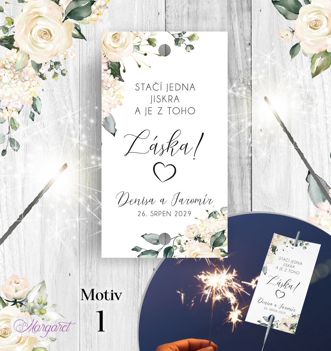 Kartička pro navlečení na prskavu. Obsahuje Vaše jména, datum svatby a dvě dírky pro navlečení prskavky. Prskavka není součástí balení.