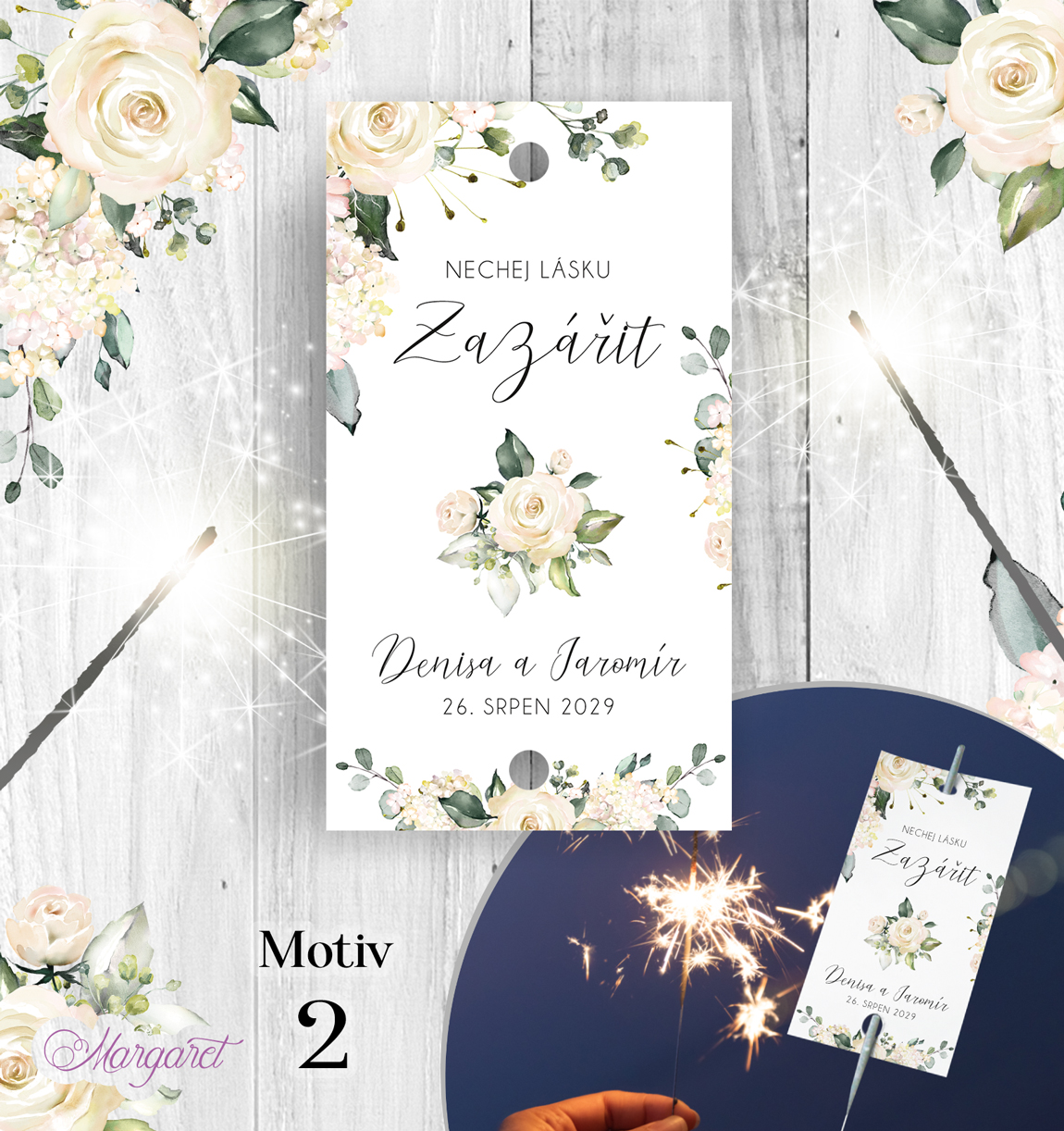 Kartička pro navlečení na prskavu. Obsahuje Vaše jména, datum svatby a dvě dírky pro navlečení prskavky. Prskavka není součástí balení.