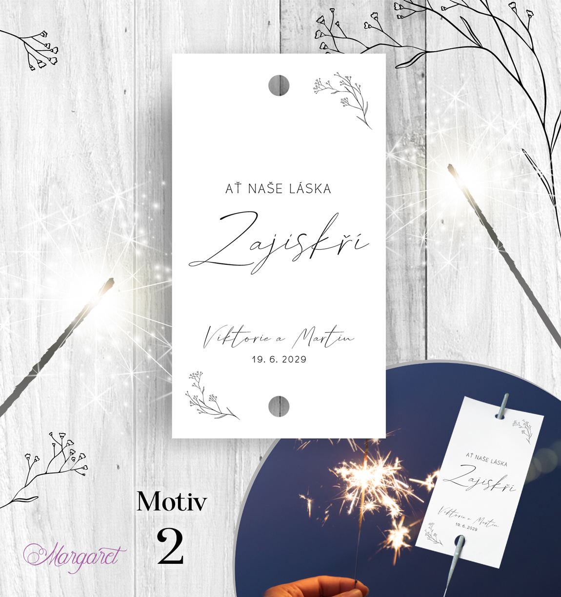 Kartička pro navlečení na prskavu. Obsahuje Vaše jména, datum svatby a dvě dírky pro navlečení prskavky. Prskavka není součástí balení.