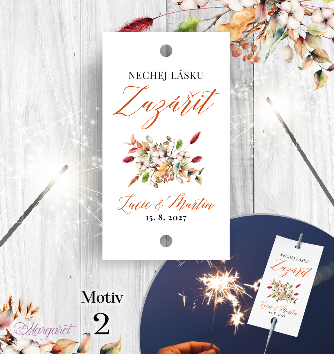 Kartička pro navlečení na prskavu. Obsahuje Vaše jména, datum svatby a dvě dírky pro navlečení prskavky. Prskavka není součástí balení.