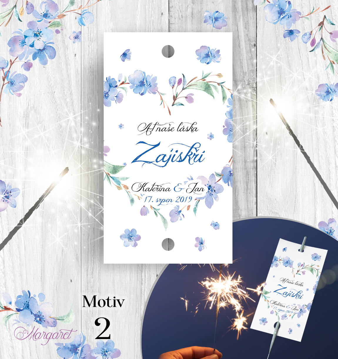 Kartička pro navlečení na prskavu. Obsahuje Vaše jména, datum svatby a dvě dírky pro navlečení prskavky. Prskavka není součástí balení.