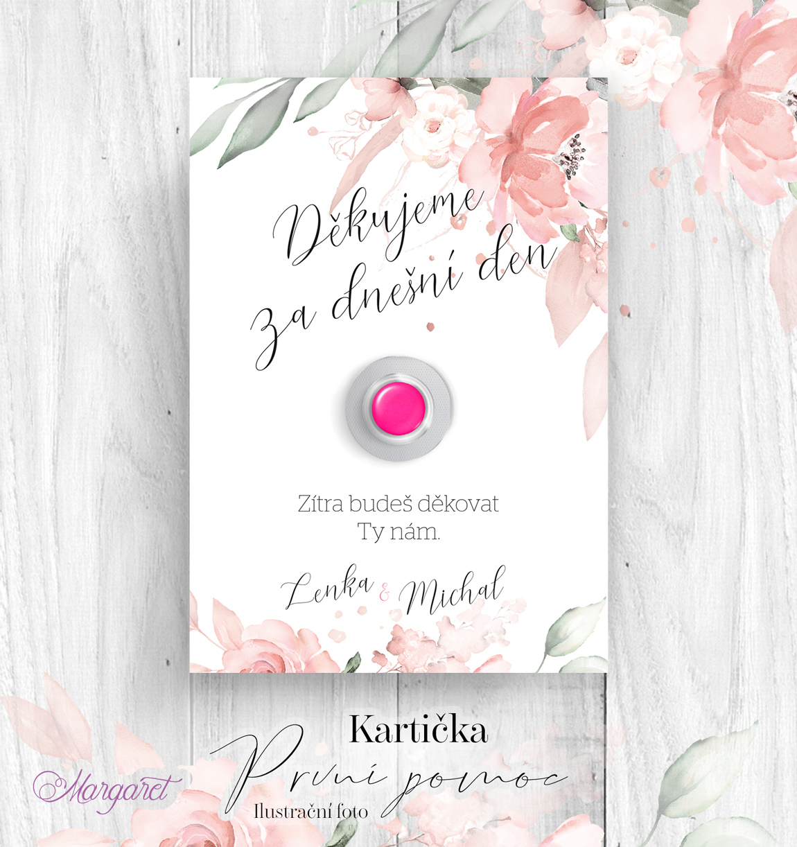 Kartička je vytištěna na hlazený karton s vysokou gramáži s textem: Děkujeme za dnešní den, zítra budeš děkovat ty nám. Obsahuje místo pro nalepení tabletky. Včetně vašich jmen a data svatby.