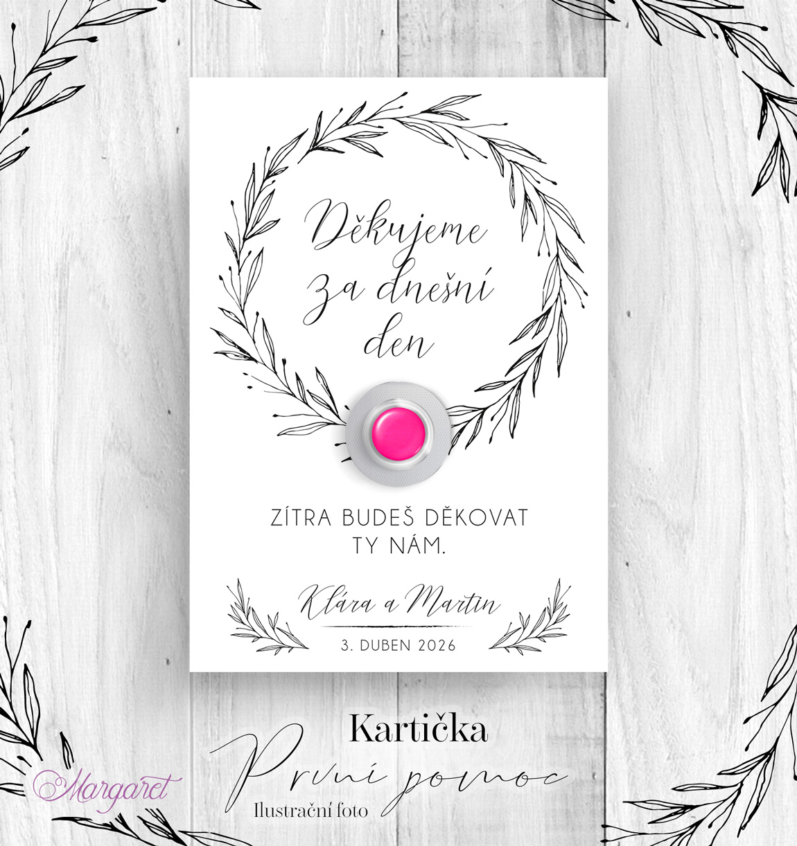 Kartička na tabletku je ideálním doplňkem po náročné svatební noci. Je to originální a zábavný způsob, jak poděkovat svatebčanům za jejich účast. Tabletka není součásti balení.