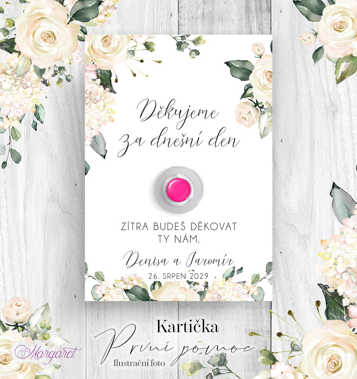 Kartička je vytištěna na hlazený karton s vysokou gramáži s textem: Děkujeme za dnešní den, zítra budeš děkovat ty nám. Obsahuje místo pro nalepení tabletky. Včetně vašich jmen a data svatby.