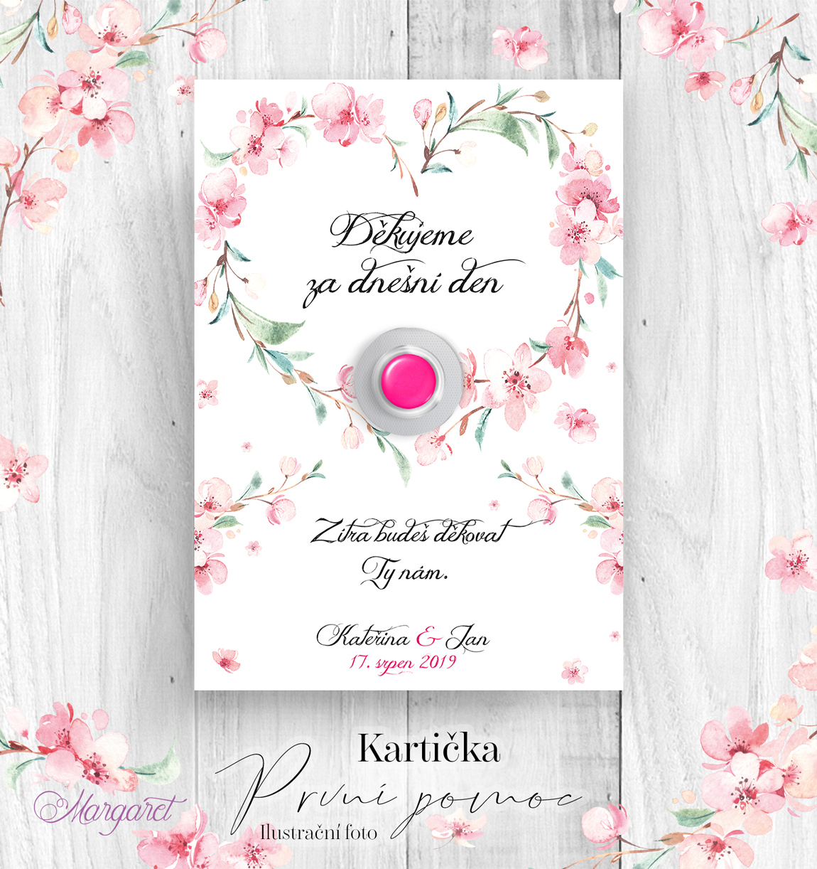 Kartička je vytištěna na hlazený karton s vysokou gramáži s textem: Děkujeme za dnešní den, zítra budeš děkovat ty nám. Obsahuje místo pro nalepení tabletky. Včetně vašich jmen a data svatby.