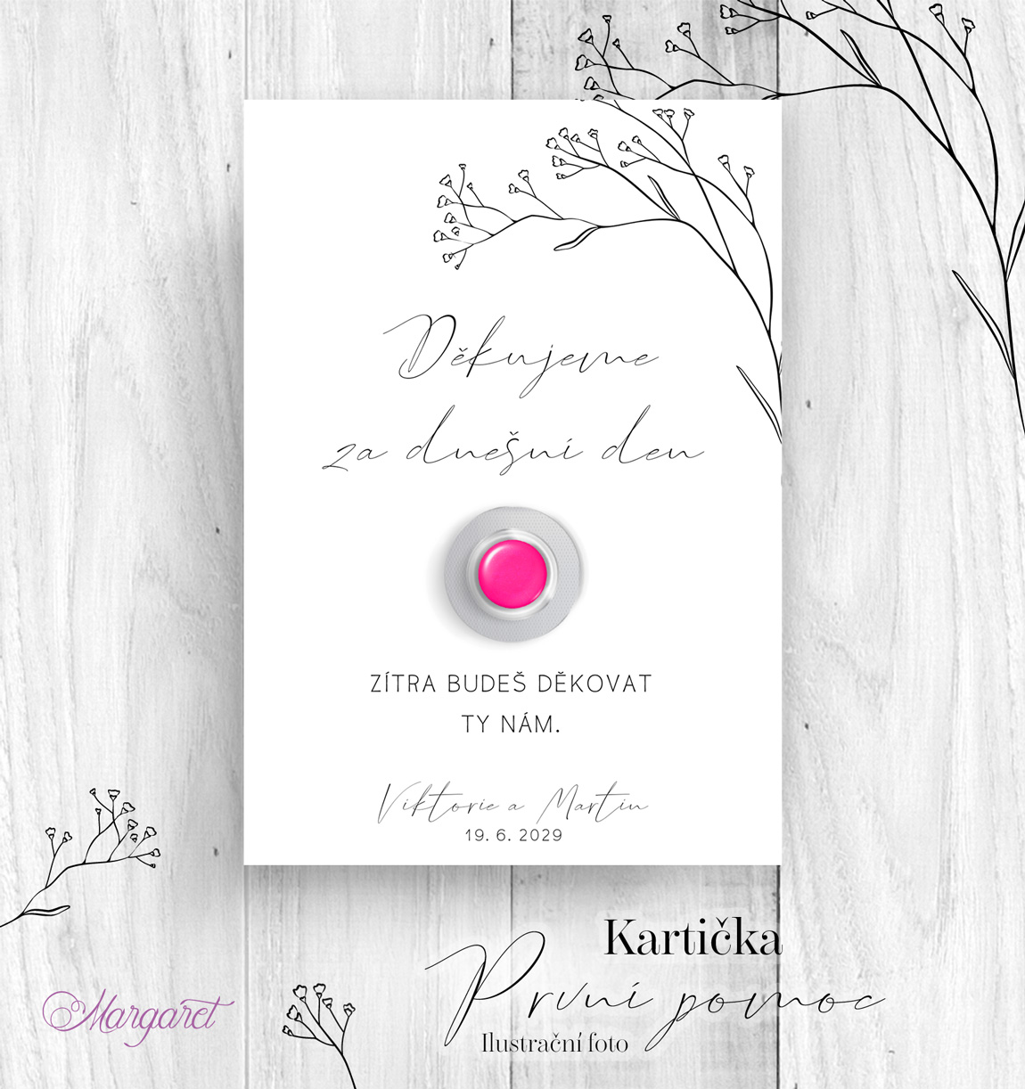 Kartička na tabletku je ideálním doplňkem po náročné svatební noci. Je to originální a zábavný způsob, jak poděkovat svatebčanům za jejich účast. Tabletka není součásti balení.