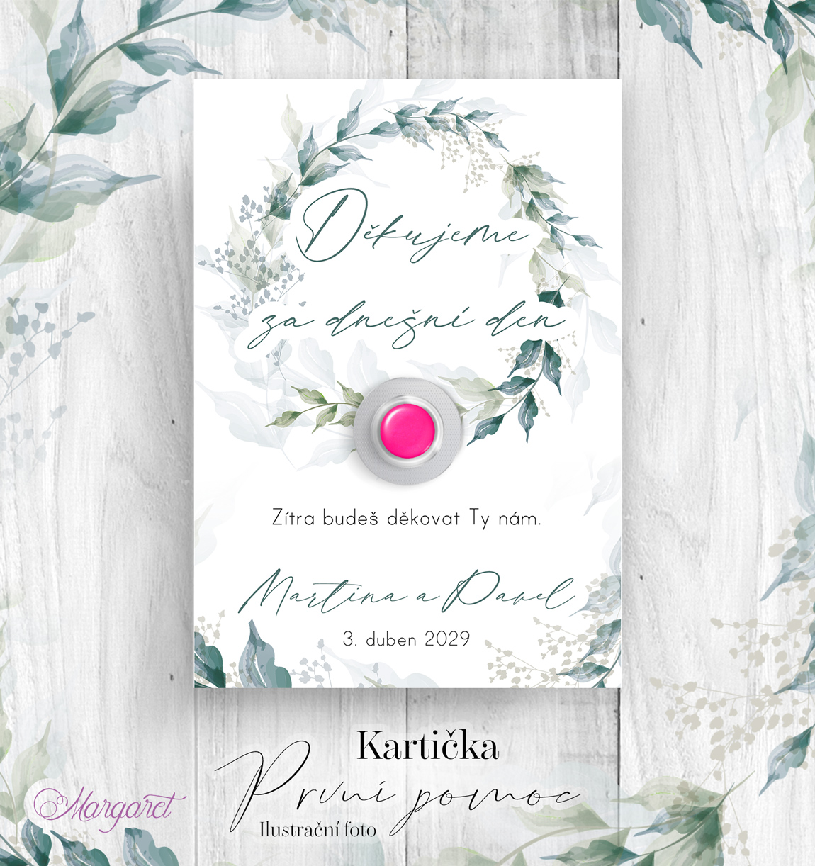 Kartička je vytištěna na hlazený karton s vysokou gramáži s textem: Děkujeme za dnešní den, zítra budeš děkovat ty nám. Obsahuje místo pro nalepení tabletky. Včetně vašich jmen a data svatby.