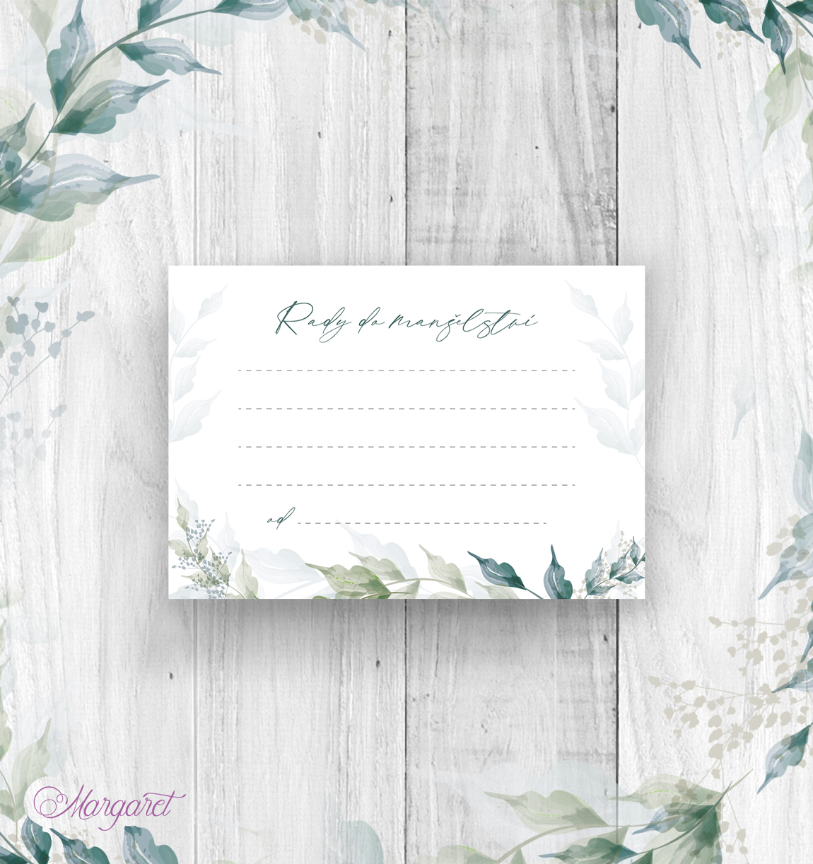 Další možností, jak zabavit Vaše hosty na svatbě, jsou kartičky “Rady do manželství”. Díky těmto kartám Vám mohou svatebčané poskytnout poučné, cenné nebo naopak zábavné rady do Vašeho nadcházejícího manželství. Hosté se zabaví při psaní, vy se zabavíte při čtení a navíc vám zůstanou krásné vzpomínky.