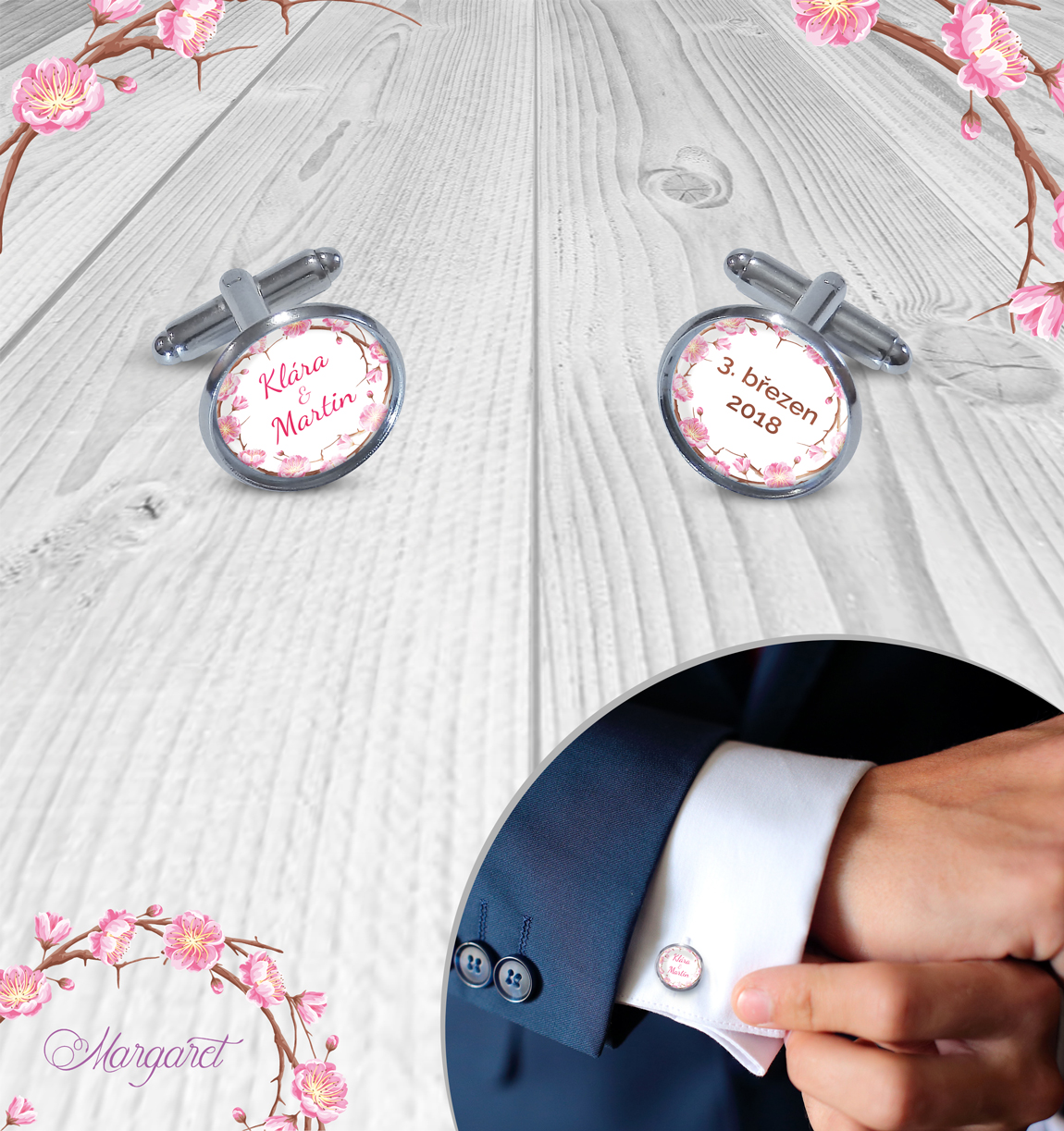 Krásný doplněk nebo dárek pro ženicha – manžetové knoflíčky s motivem svatby a Vašimi iniciály.