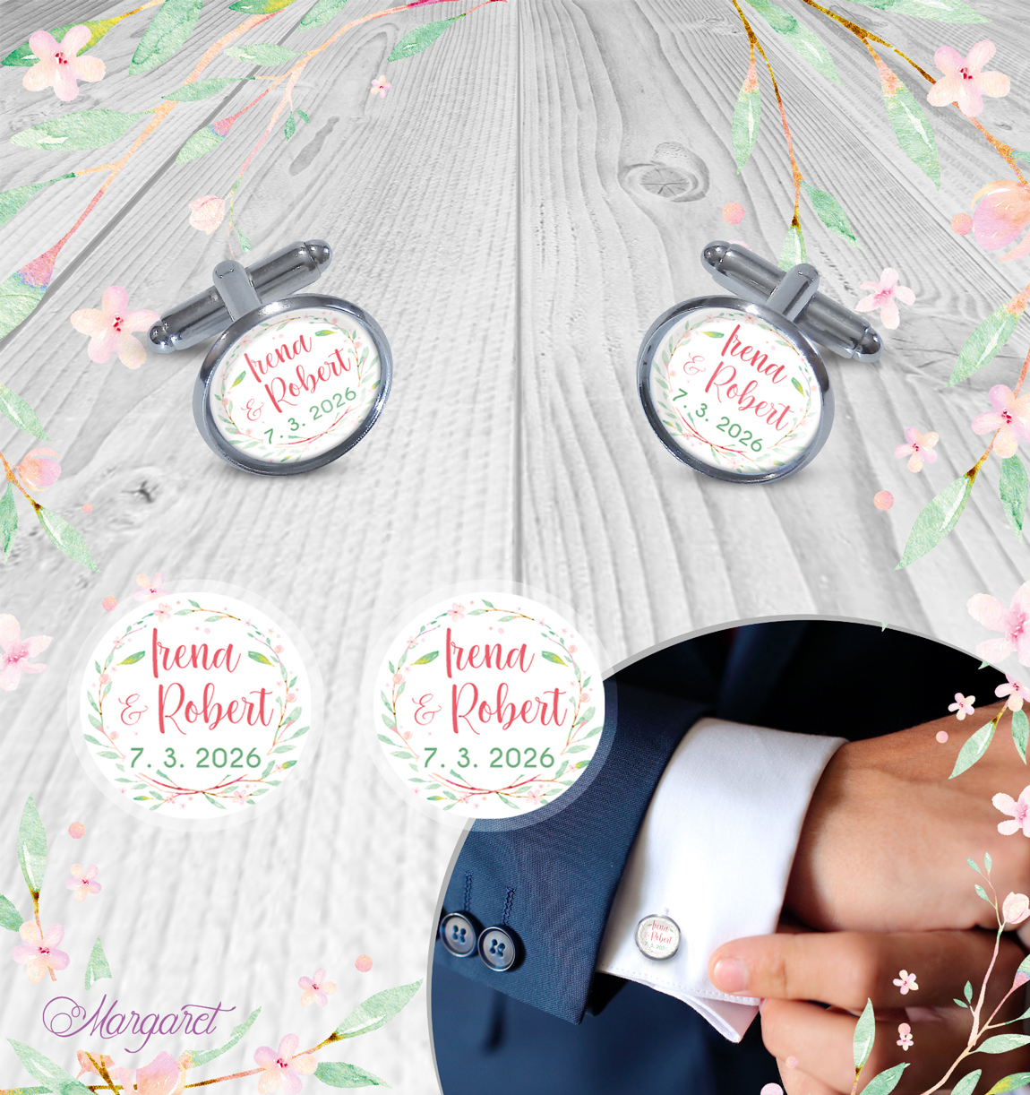Krásný doplněk nebo dárek pro ženicha – manžetové knoflíčky s motivem svatby a Vašimi iniciály.