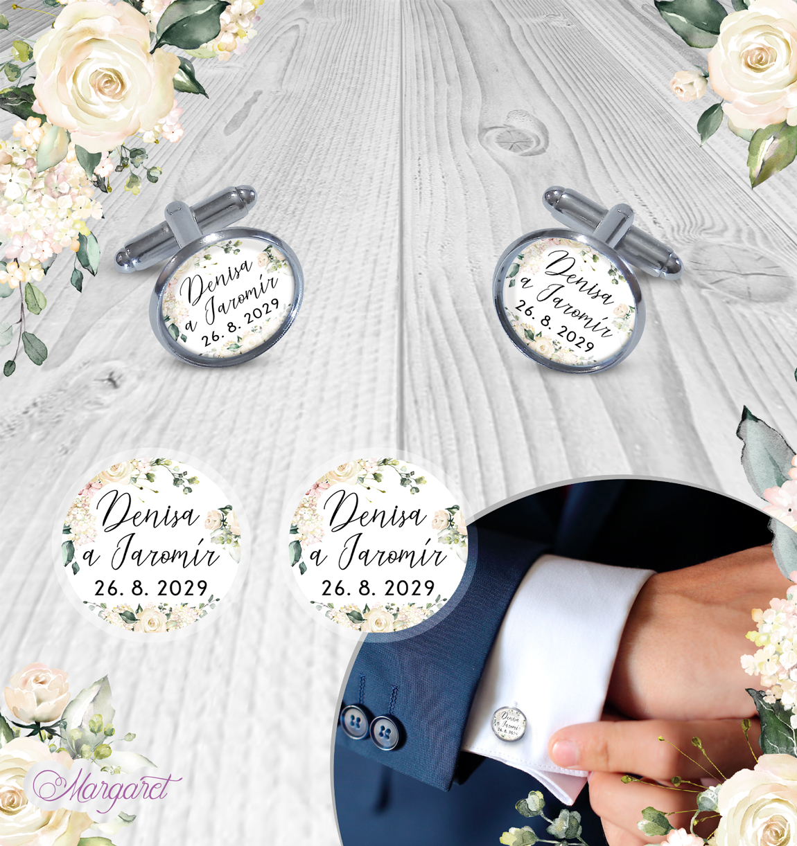 Krásný doplněk nebo dárek pro ženicha – manžetové knoflíčky s motivem svatby a Vašimi iniciály.
