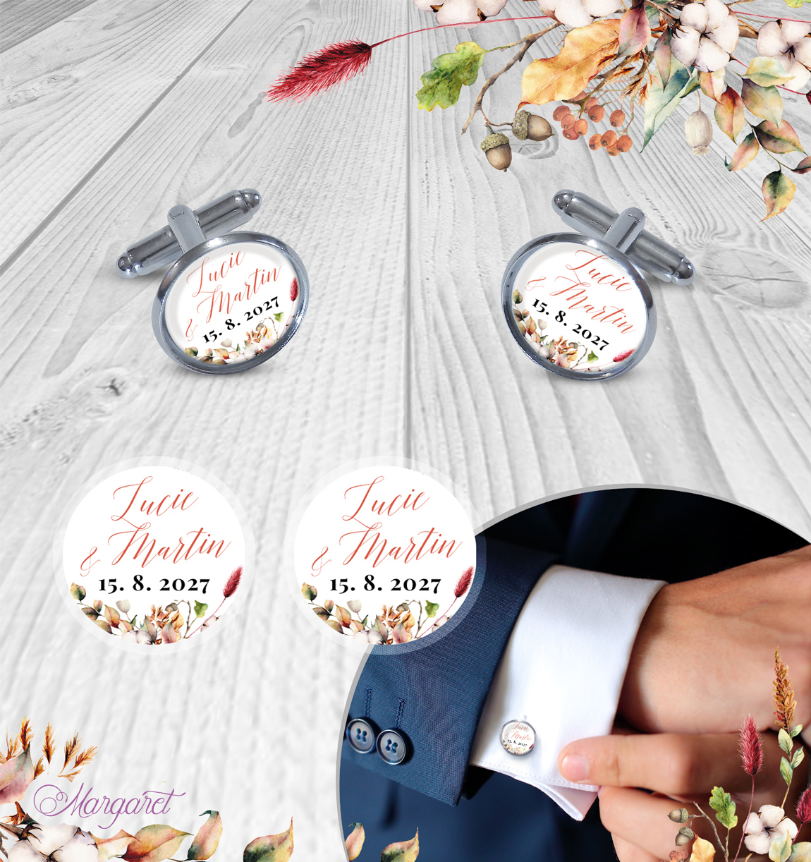 Krásný doplněk nebo dárek pro ženicha – manžetové knoflíčky s motivem svatby a Vašimi iniciály.