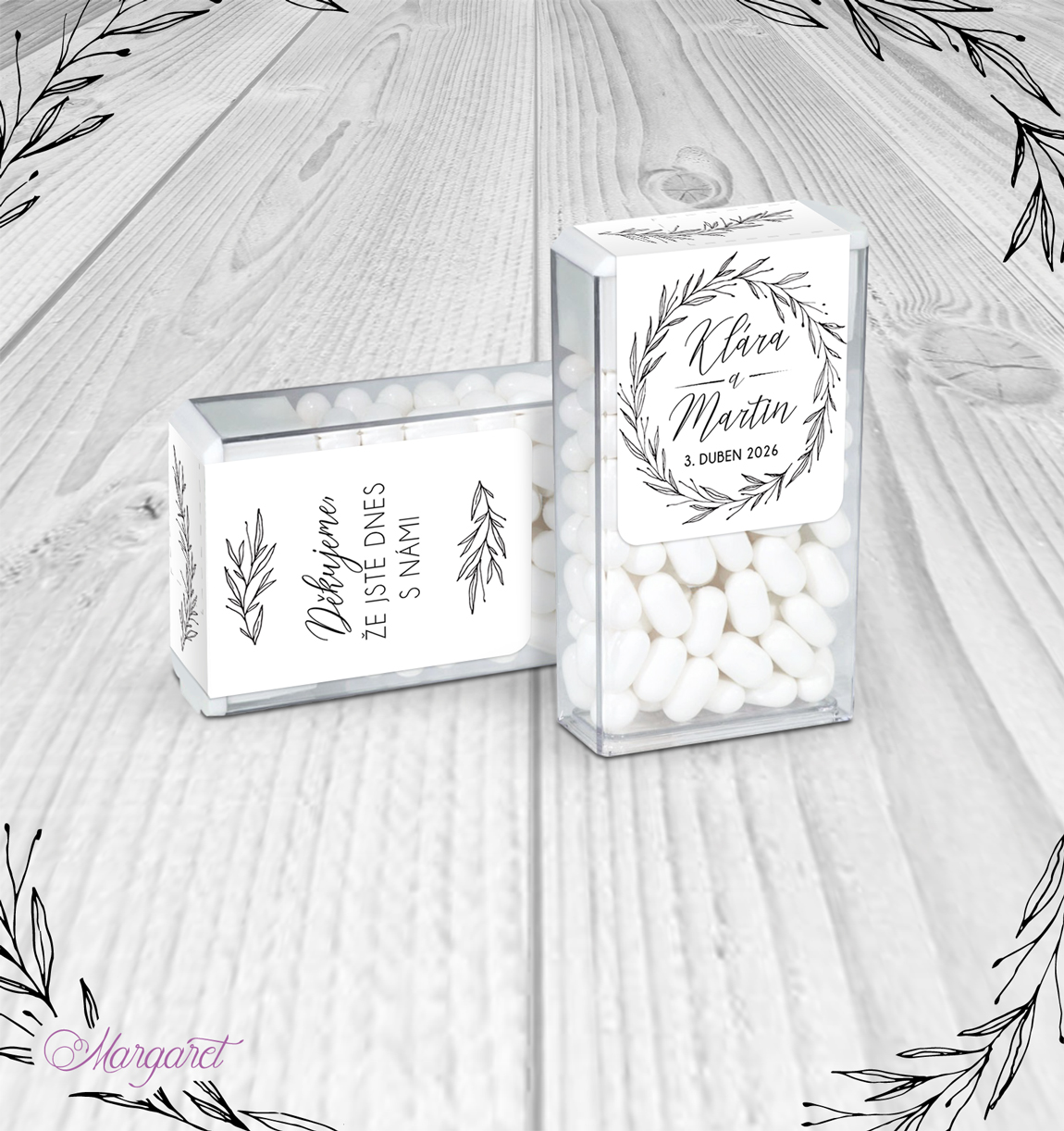 Krabička osvěžujících dražé bonbónků s etiketou ve stylu Vaší svatby, ideální na sladký bar nebo jen tak na svatební stoly.