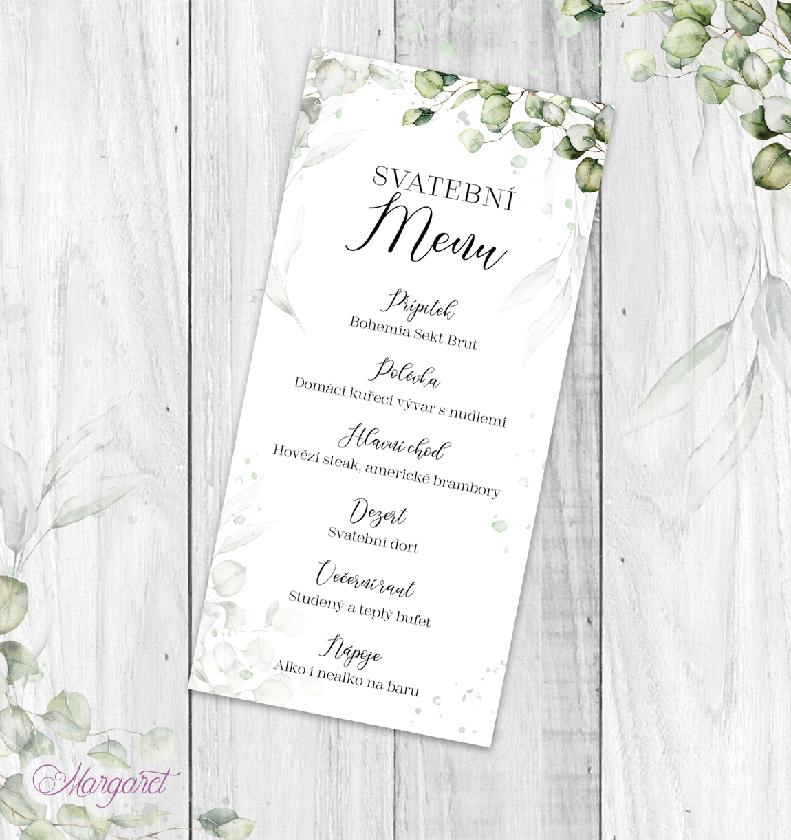 Svatební menu ve stylu svatební kolekce. Je vhodným doplňkem na svatební tabuli, kde si hosté můžou přečíst svatební menu.