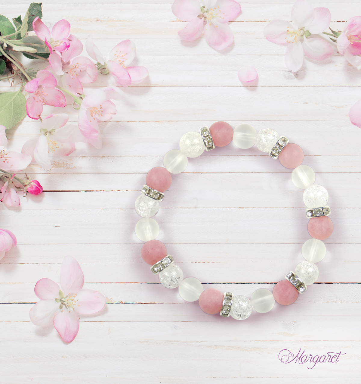 Náramek je vyrobený z minerálních korálků. Kovové části jsou bižuterní komponenty. Doporučujeme vyhýbat se kontaktu s vodou. Náramek udržujte v suchu. Nevhodné pro děti do 3 let, obsahuje malé části.