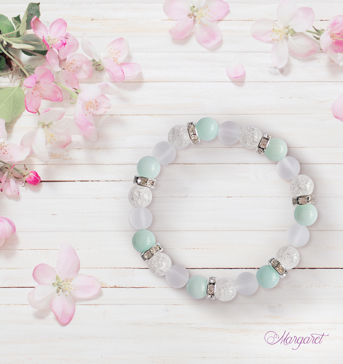 Náramek je vyrobený z minerálních korálků. Kovové části jsou bižuterní komponenty. Doporučujeme vyhýbat se kontaktu s vodou. Náramek udržujte v suchu. Nevhodné pro děti do 3 let, obsahuje malé části.