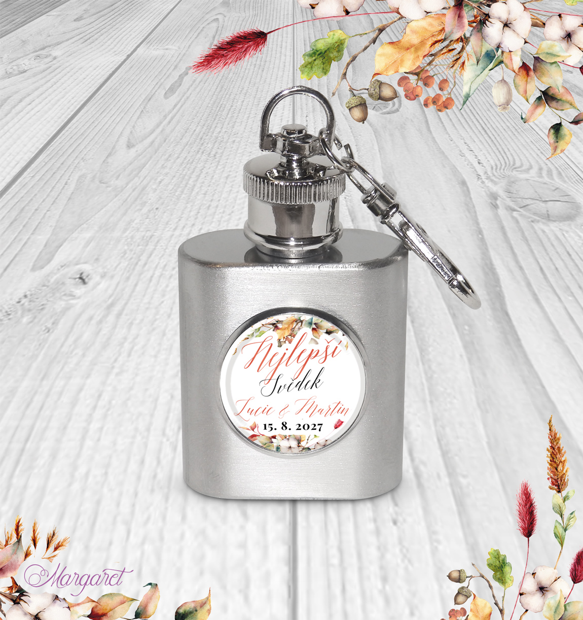 Malá pohotovostní placatka, jako přívěšek na klíče, v motivu Vaší svatby. Krásný dárek pro svědka, tatínka, bratra. S nápisem “Nejlepší svědek”. Materiál – nerezová ocel.
