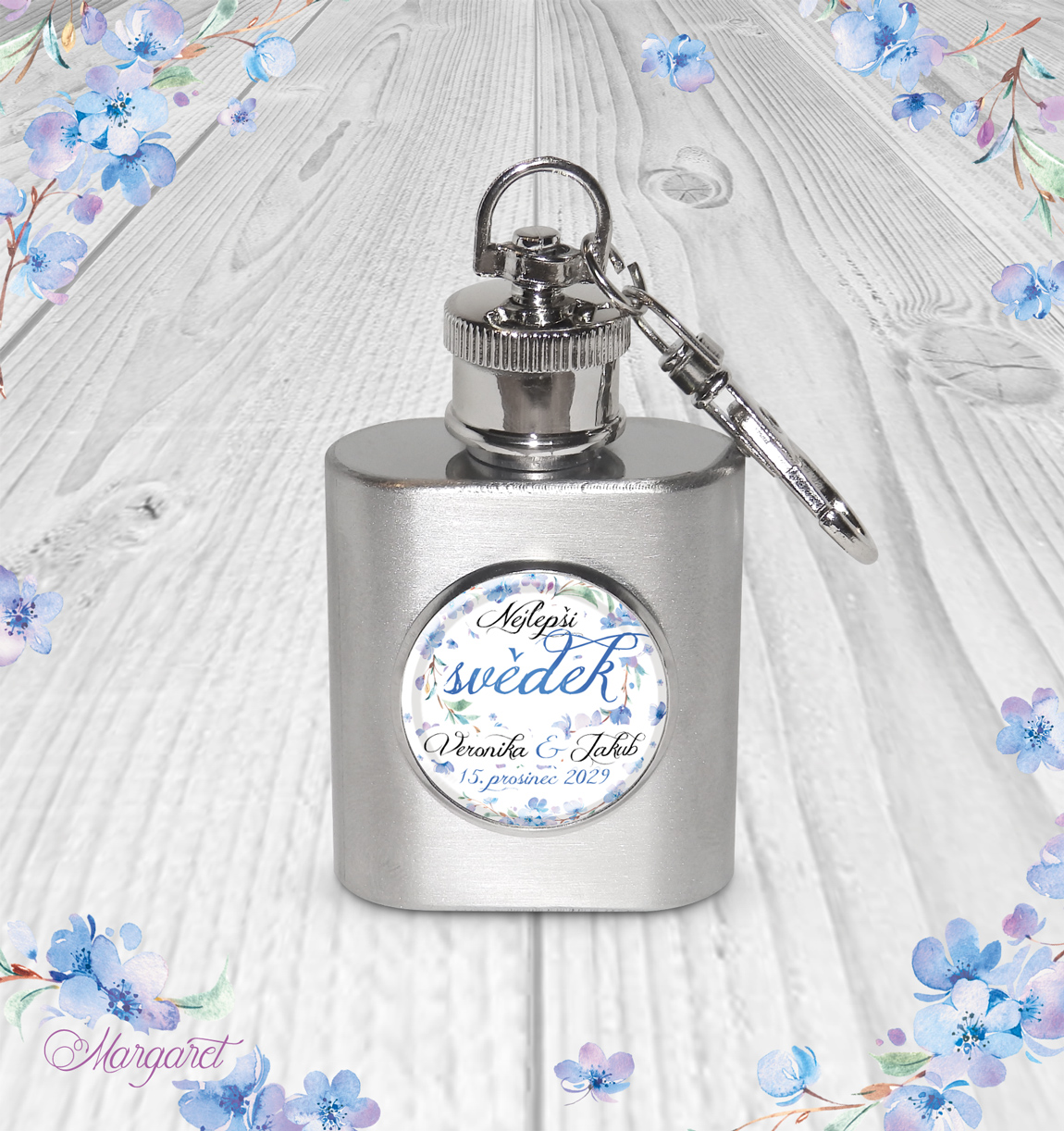 Malá pohotovostní placatka, jako přívěšek na klíče, v motivu Vaší svatby. Krásný dárek pro svědka, tatínka, bratra. S nápisem “Nejlepší svědek”. Materiál – nerezová ocel.