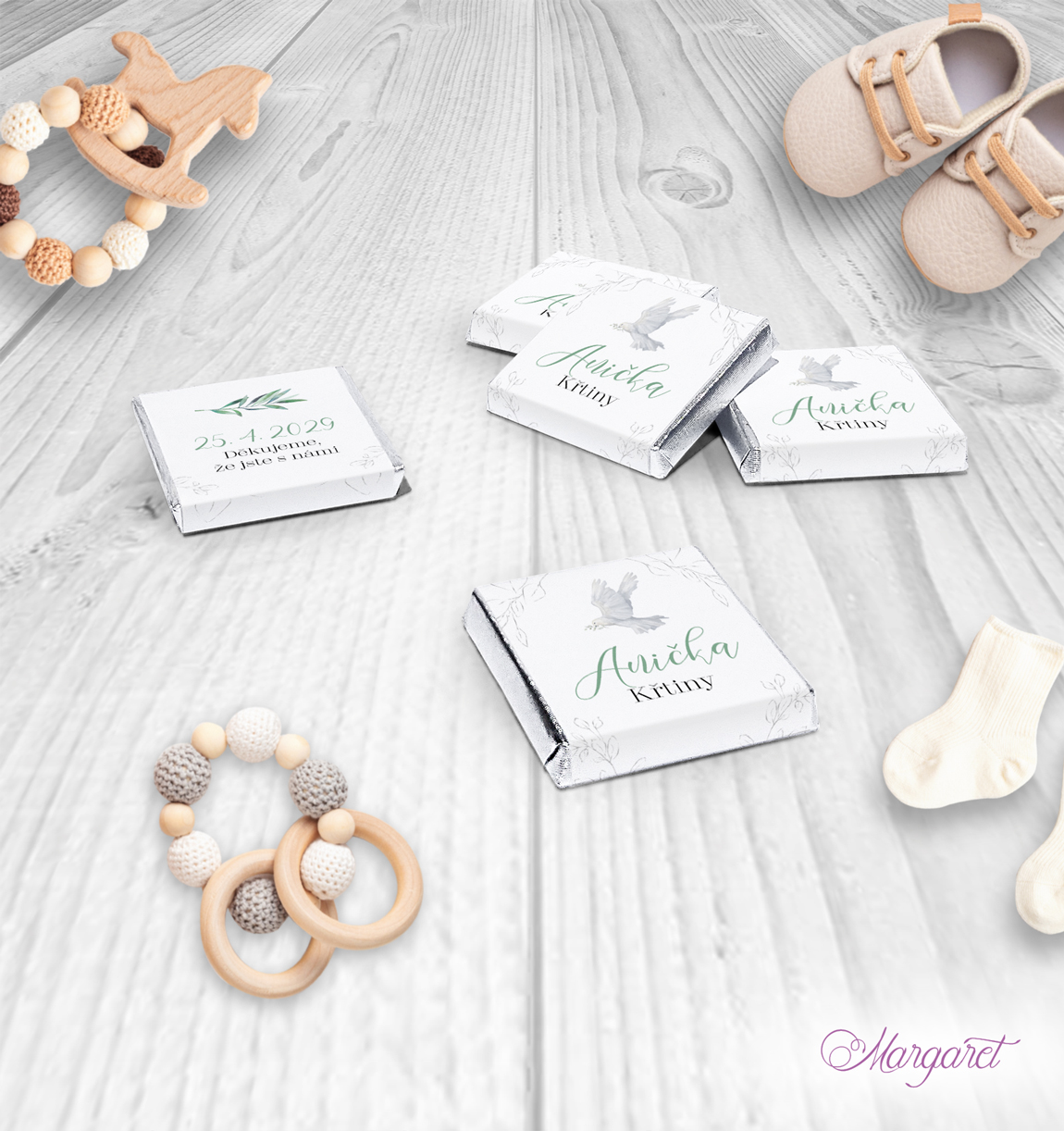 Skvělým doplňkem, který potěší nejen děti, ale i dospělé, jsou malé čokoládky. Se jménem a datem křtu Vašeho potomka.