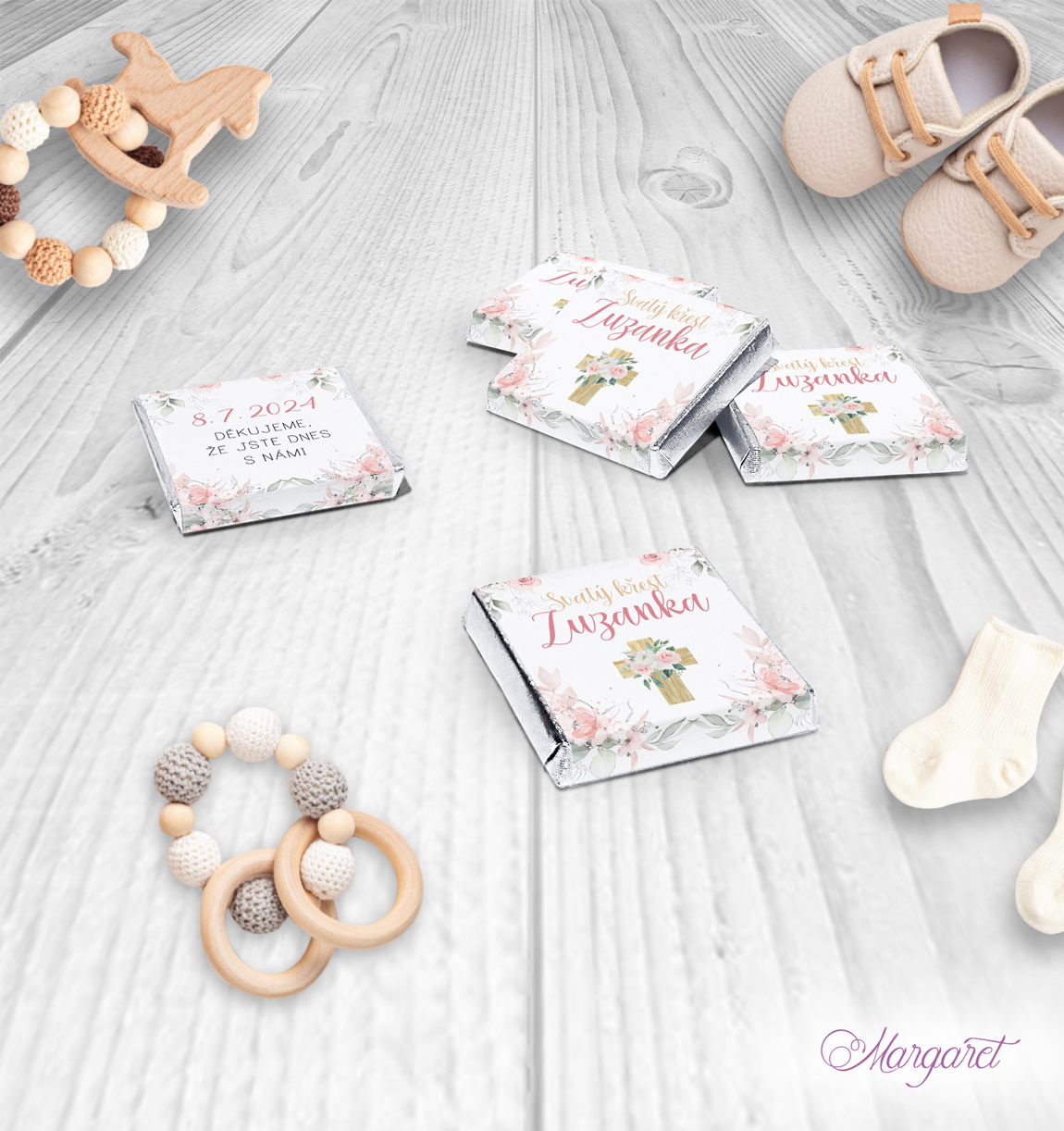 Skvělým doplňkem, který potěší nejen děti, ale i dospělé, jsou malé čokoládky. Se jménem a datem křtu Vašeho potomka.