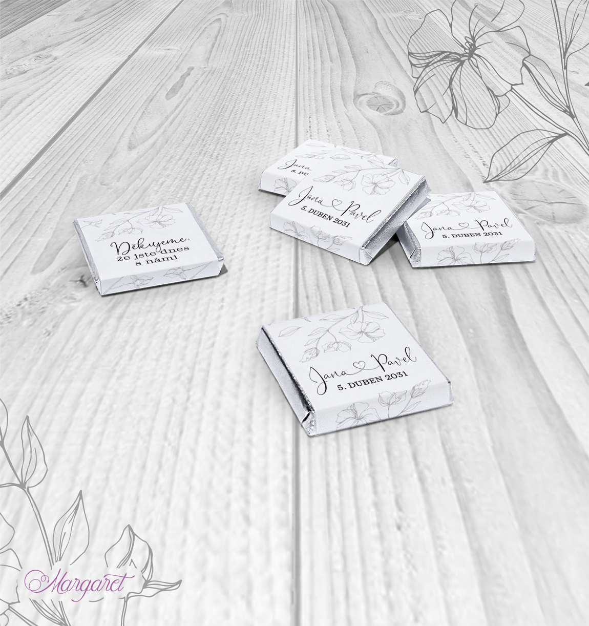 Neodmyslitelnou sladkou tečkou slavnostního dne jsou svatební čokoládky, které doplní Váš svatební stůl a potěší svatební hosty. Na etiketě jsou Vaše jména a datum svatby.