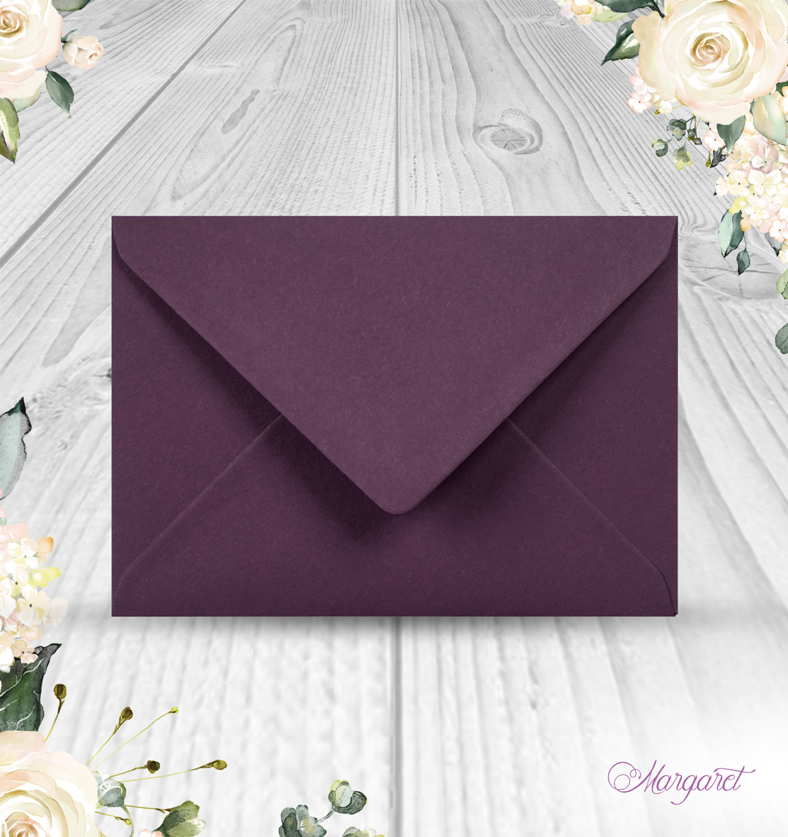 Pastelová obálka v barvě Bordó se šípovou klopou pro oznámení A6 ze svatební kolekce.