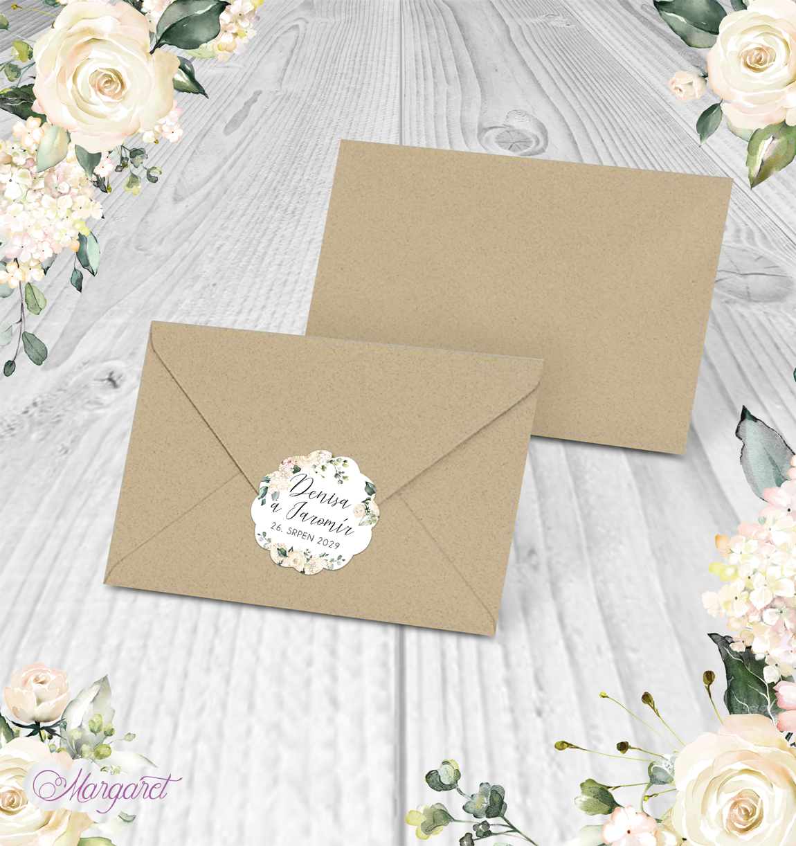 Kraftová obálka, bez potisku, ideální pro podlepené oznámení A6. Včetně samostatně dodávaných pečetí v designu Vaší svatby, s Vašimi jmény a datem svatby.