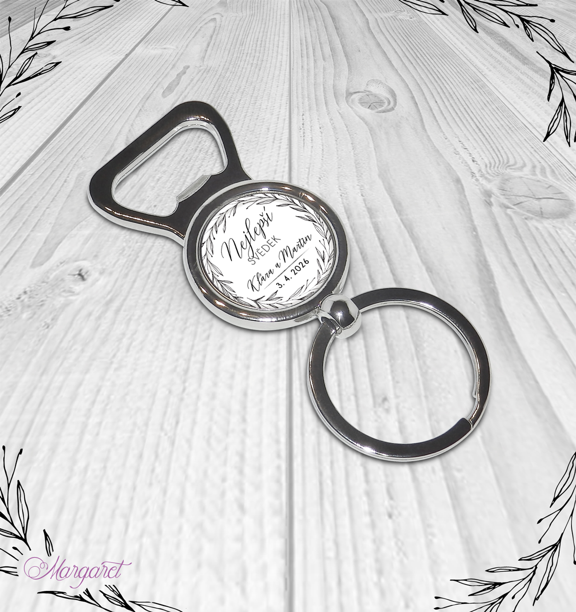 Otvírák jako přívěšek na klíče, krásný dárek pro svědka, tatínka, bratra. S Vašimi jmény a údaji. S nápisem “Nejlepší svědek”. Materiál – nerezová ocel.