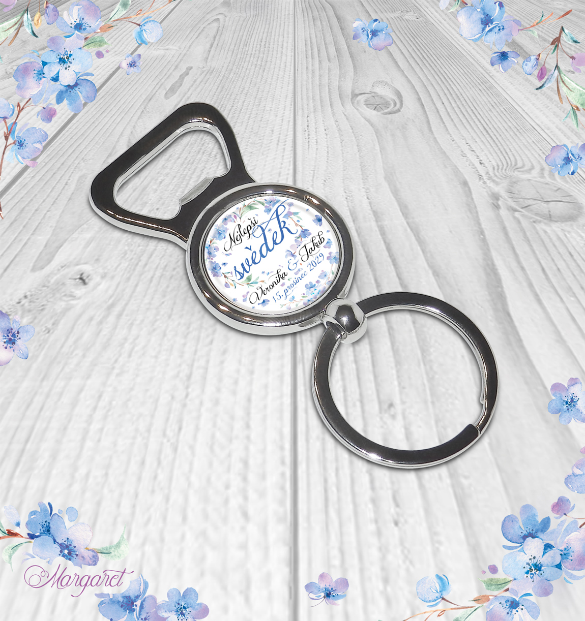 Otvírák jako přívěšek na klíče, krásný dárek pro svědka, tatínka, bratra. S Vašimi jmény a údaji. S nápisem “Nejlepší svědek”. Materiál – nerezová ocel.