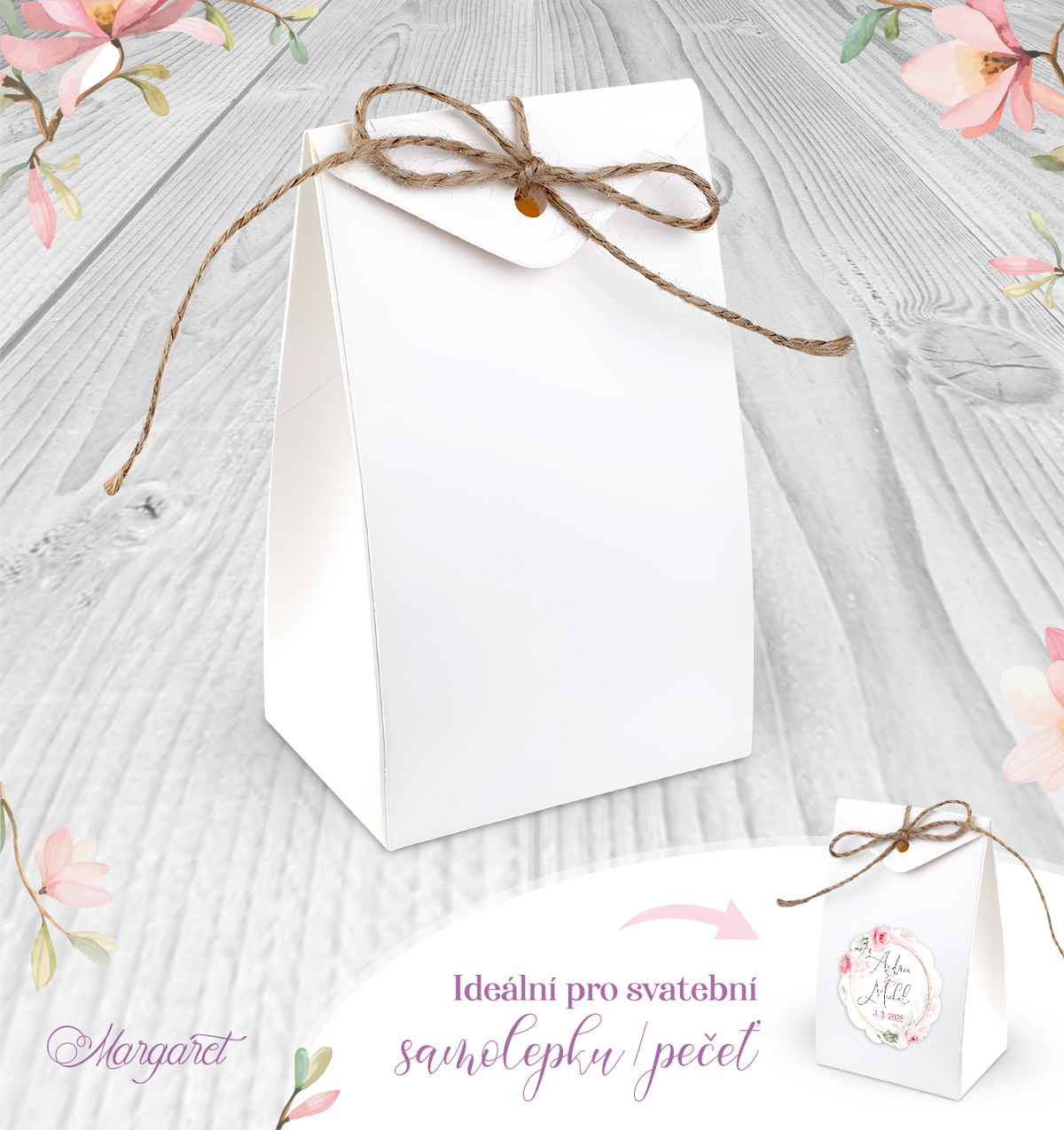 Stylová bílá, papírová krabička na drobné dárky pro svatebčany, která se skvěle hodí jako milá pozornost na svatební stůl nebo pro předání malých dárečků.