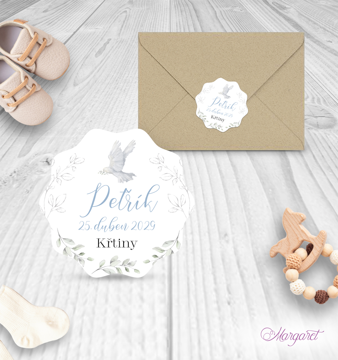 Pečeť / nálepka, kterou můžete využít na obálky, dárečky a mnoho dalšího. Se jménem a datem křtu Vašeho potomka.