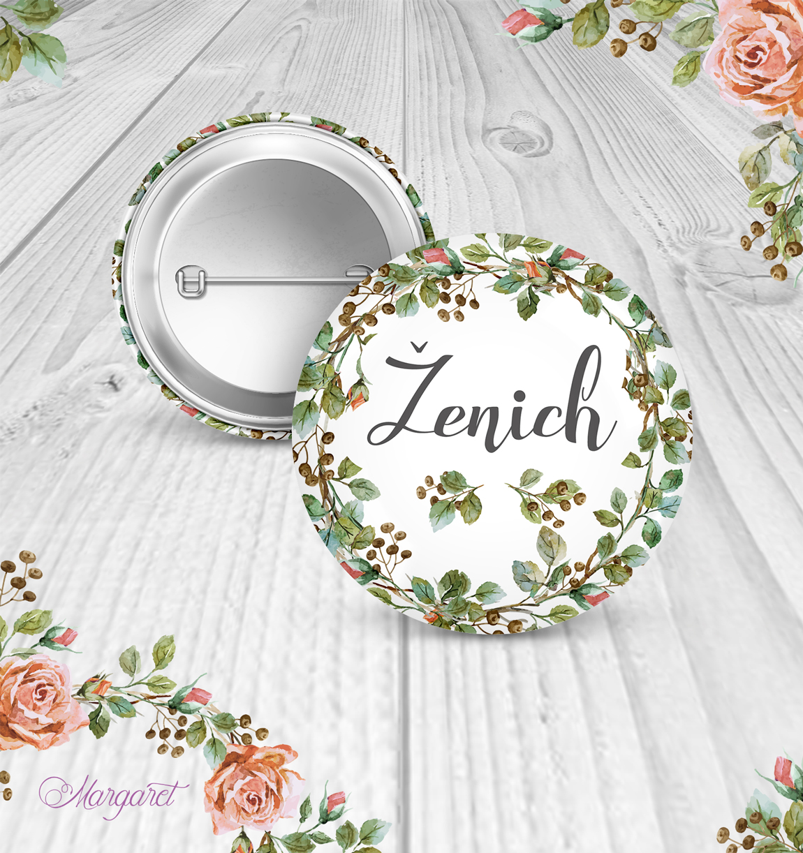 Placka na rozlučku se svobodou – s nápisem "Ženich", v designu Vaší svatby.