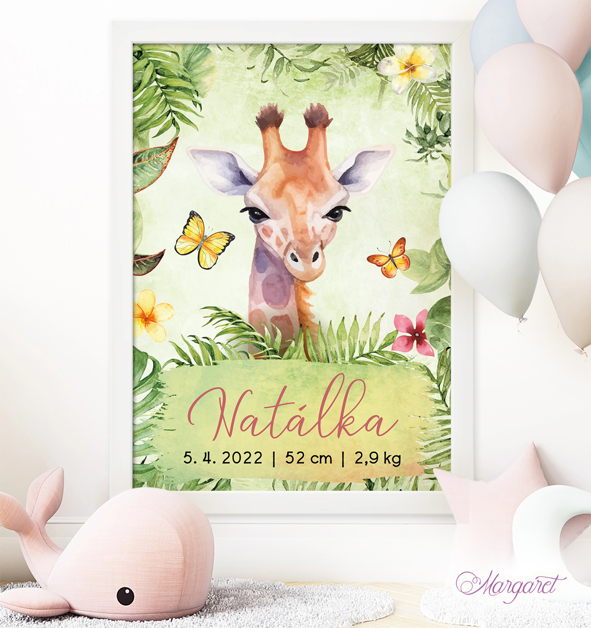 Dětský plakátek se zvířátky, se jménem, datem narození, porodní výškou a váhou – plakát do pokoje pro malé děti a miminka (můžeme také zpracovat pouze se jménem a datem narození).