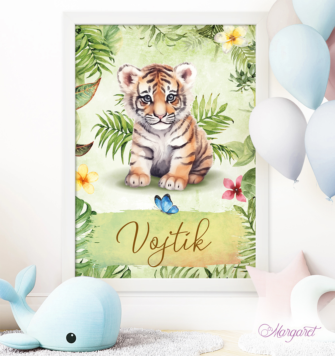 Dětský plakátek se zvířátky, se jménem vašeho děťátka – plakát do pokoje pro malé děti a miminka (v nabídce také varianta s údaji – datum narození, porodní výška a váha).