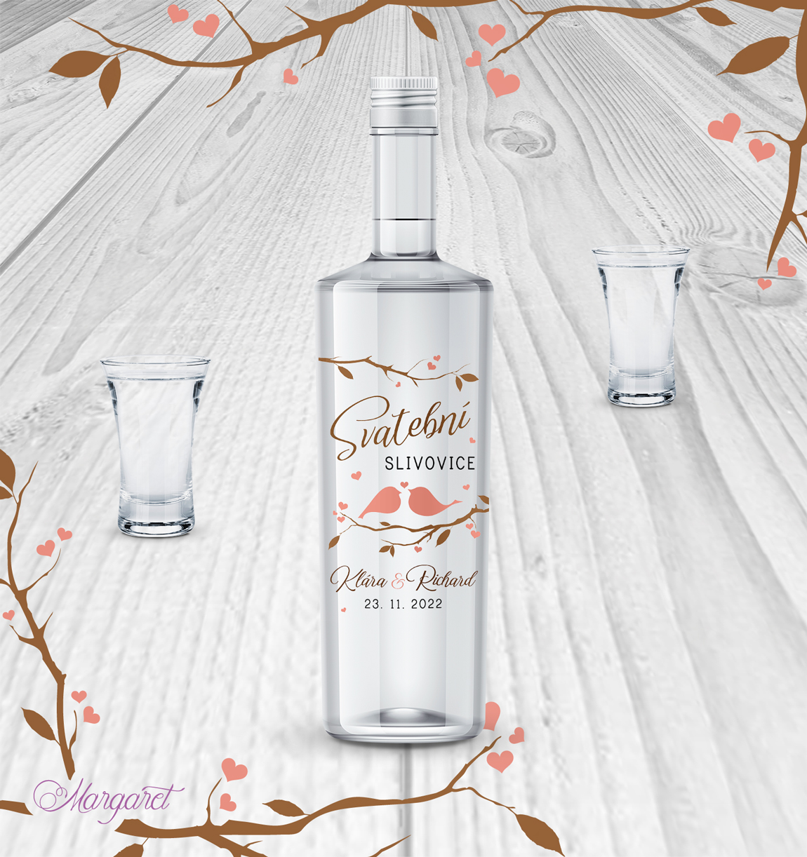 Luxusní průhledná etiketa na slivovici. Pálenka, kořalka nebo slivovice bývá nedílnou součástí svatby. Naše etikety jsou navržené, aby se hodily skvěle do stylu Vaší svatby, s Vašimi jmény a datem svatby.