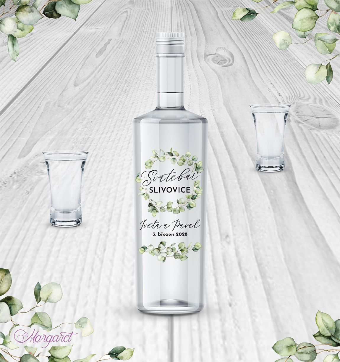 Luxusní průhledná etiketa na slivovici. Pálenka, kořalka nebo slivovice bývá nedílnou součástí svatby. Naše etikety jsou navržené, aby se hodily skvěle do stylu Vaší svatby, s Vašimi jmény a datem svatby.